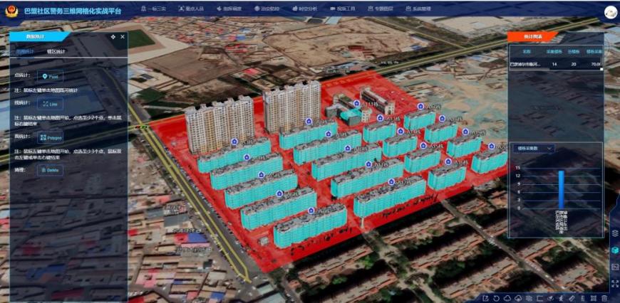 用户可在三维地图上选择需要统计的区域,并自动分析出选择范围内的人口数量、房屋数量、楼栋数量、单位数量等统计信息,同时还可根据警务辖区范围,在三维地图中直接统计各警务辖区内的楼栋、房屋、人员、单位,以及三实信息采集率等信息。