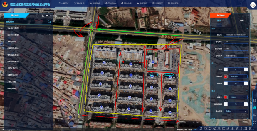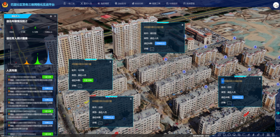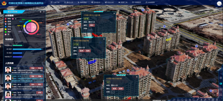 基于二三维地图,可实时展现本网格或者区域关注重点人员的当前位置分布情况,并按不同类型重点人员颜色,在三维地图上进行展示,并对重点人员进行分级管控,以便实时掌握重点人员的动态。