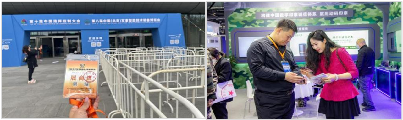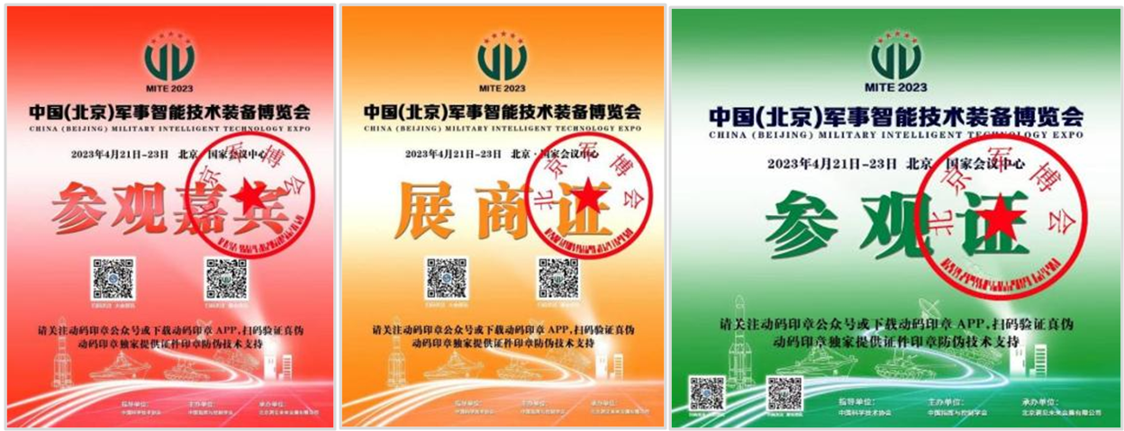 2023年4月21-23日,动码印章为第八届军博会提供证件印章防伪支持,本届军博会的各类证件30000余张使用了动码印章,大众只需使用动码印章APP、微信公众号、微信小程序或支付宝小程序,扫描证件上的印章即可核验证件真伪,为嘉宾、友商的参展之旅增添一份安心与保障。