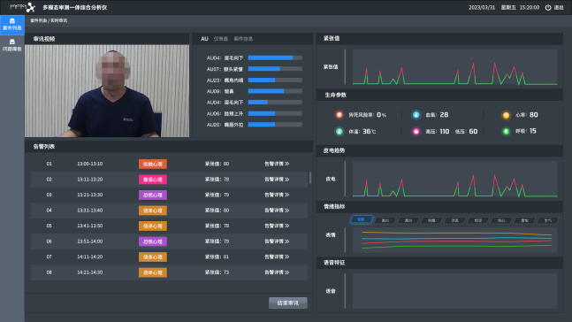 产品采用接触式和非接触式两种形式进行数据采集,通过摄像头以非接触形式对嫌疑人的微表情、心率、血压等生理特征进行检测,同时采用接触式皮电传感器获取嫌疑人皮电数据,通过多模态融合算法融合微表情、声强、皮电等多个模态综合分析,为案件侦破提供有效助力。