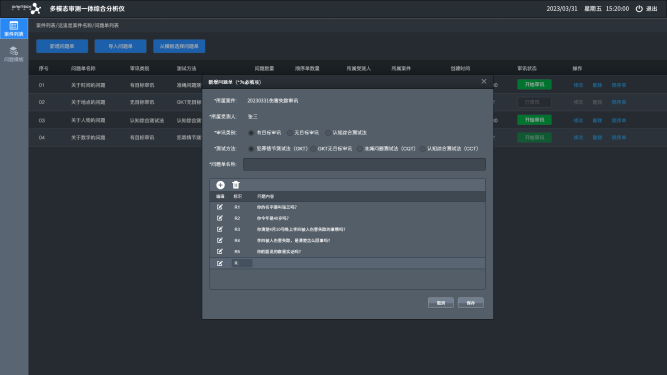 多模态审测一体综合分析仪采用国内先进的多模态感知技术,结合审讯心理学、神经科学和机器学习方法,突破传统审讯测试的弊端,接触式和非接触式方法相融合,采集被测人的各项生理(心理)特征指标参数,结合微表情、微动作等多道生理参量和内置的紧张峰测试法、犯罪情节测试法等多种心测方法论,自动识别出被测人是否在说谎以及目前的心理状态。在讯问期间,实时监测被测人不可控的各项心理反应以及生理指标,辅助办案人员快速作出判断,找到突破口,提升办案效率。