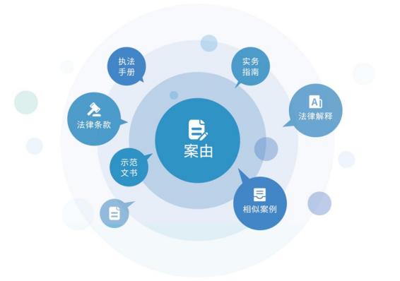 不同检索结果间相互关联,以案由为主线关联查询相应法律条款,法律解释、示范文书、相似案例等内容。同时系统实现法条与案例、实务指南、执法手册的串联内容查看。