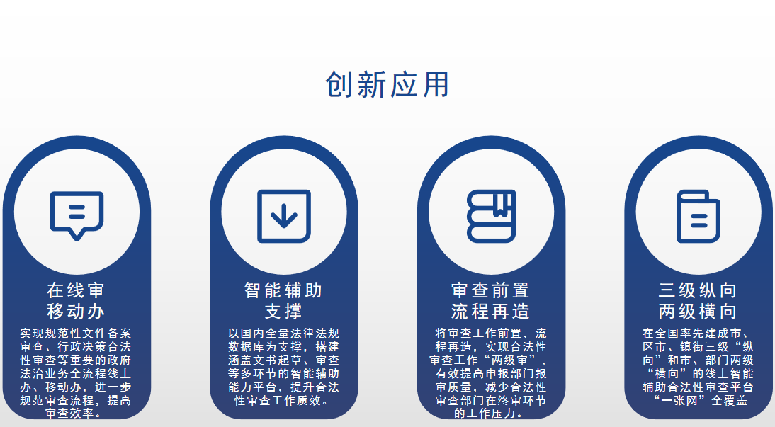 依托各业务领域的标准规范及工作指引,实现文件在线送审、审查流程再造,从源头上规范送审内容,实现线上“统一受理”,将审查流程前置,实现市、区市、镇街三级的“在线智能审”,达成合法性审查线上“统一受理、全程网办”,实现各级审查的免跑腿。