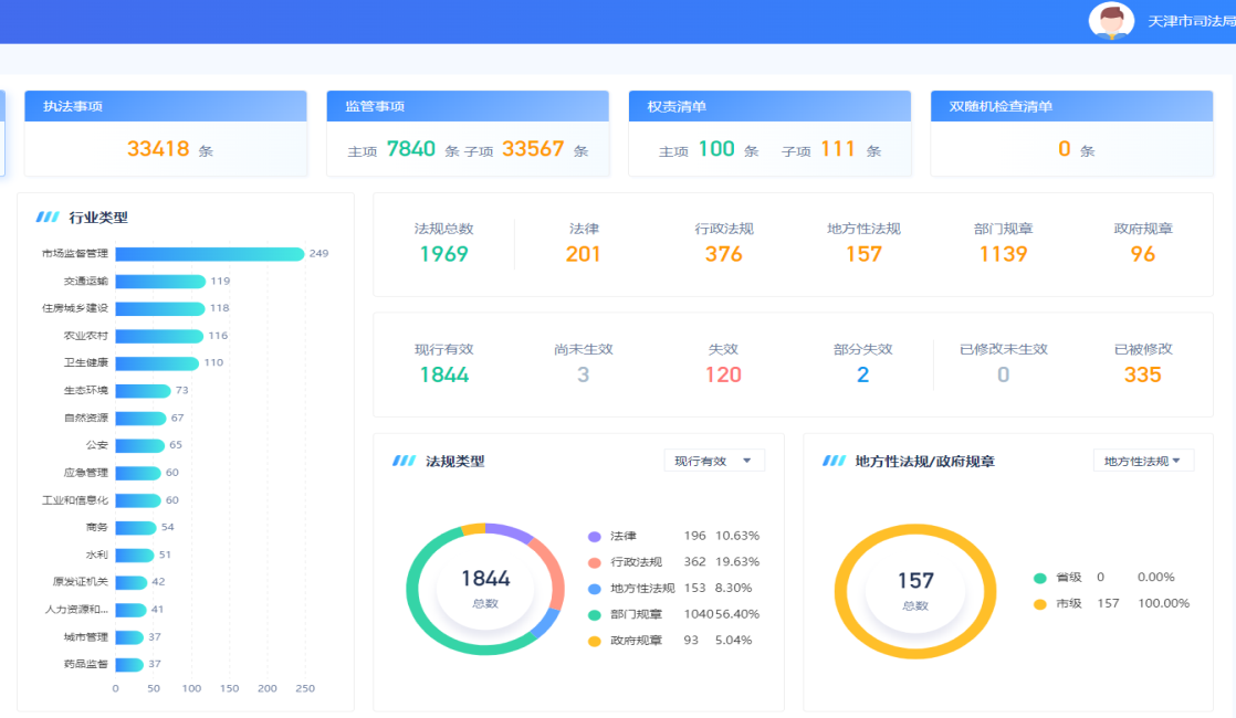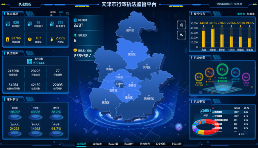 天津市司法局立足省级行政执法监督工作实际,构建集执法证件、执法依据、执法行为归集、执法监督、执法大数据分析、行政执法数据中心等于一体的行政执法监督平台,助力天津市数字法治政府建设。