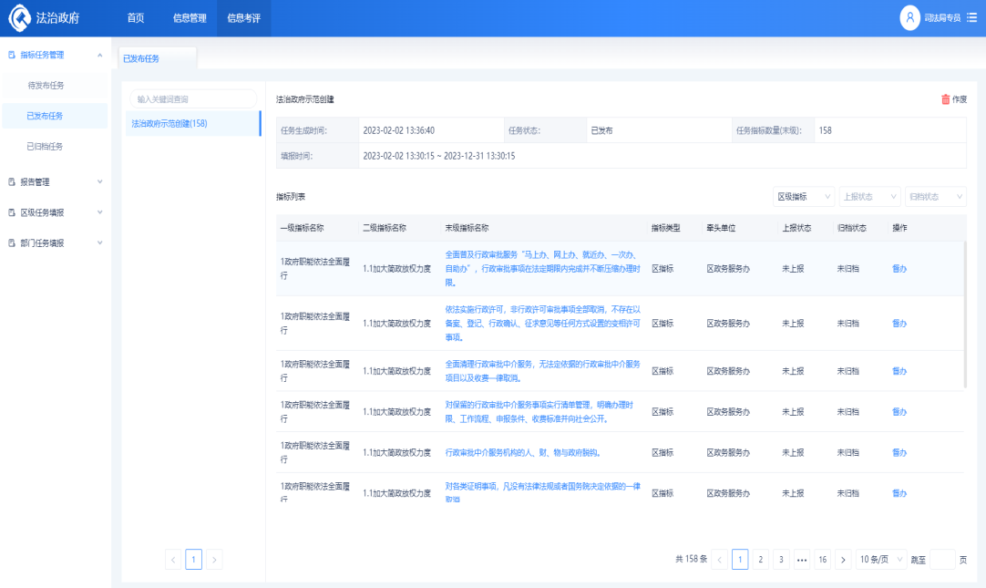 1.通过将“法治政府建设示范指标”进行拆解,形成指标任务清单,建立任务清单的线上管理能力,定义各指标的考评规则和分值比重、设置各指标的上报和审核流程。承载和管理各牵头、责任部门法治政府建设相关的资料,掌握工作任务进度情况。并且,与法治政府建设相关系统建立数据对接,实现相关数据的实时汇聚。同时,根据法治政府创建申报工作要求,将汇聚的文件资料,自动形成申报文档,助力地方法治政府建设工作。
