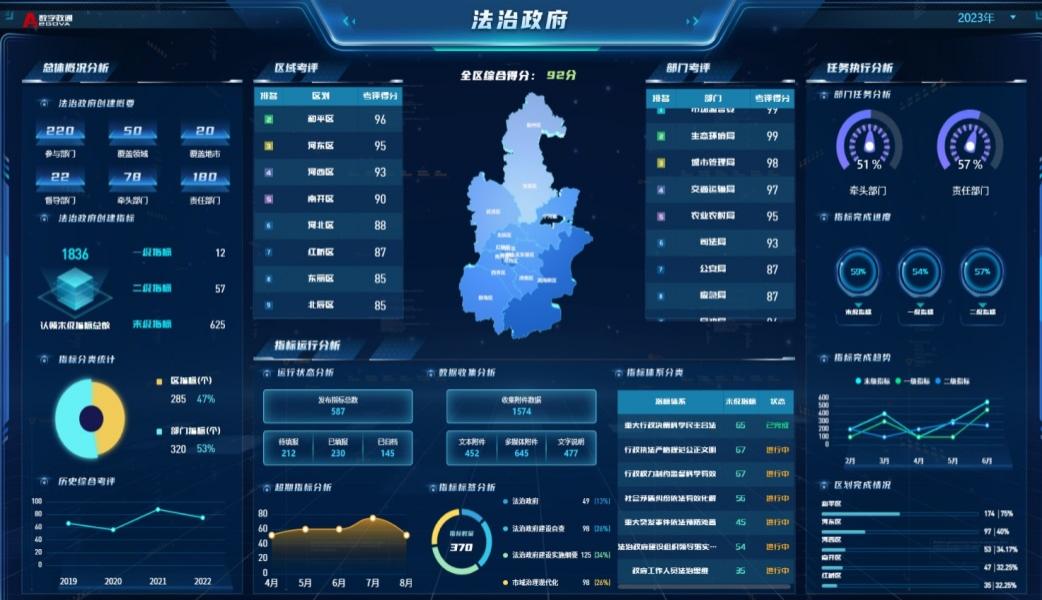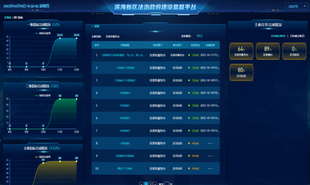 3.通过将法治政府建设工作各项工作指标化、体系化,利用大数据算法模型,实现对法治政府建设示范指标运行情况的分类分级统计分析,辅助管理人员清晰掌握法治政府建设任务推进和完成情况,为领导决策提供能力支撑。