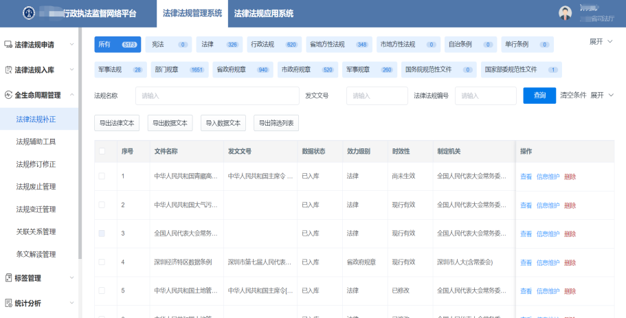 为支撑某省一体化行政执法平台高效运转,每年对其更新法律法规千余部,有效支持行政执法事项更新,有效推进各行政执法单位裁量基准的更新,全面提升依法行政水平。法律法规动态更新,联动执法事项动态更新,联动裁量基准动态更新大大提升了行政执法和依法行政法规应用效率。