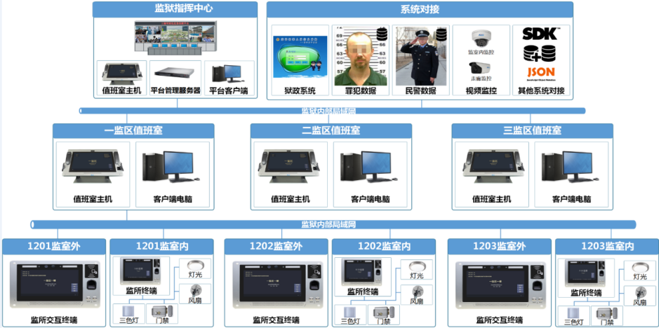 针对监管场所的实际情况和特点,在现有的功能上进行定制化开发。现有的系统功能主要包括可视对讲,身份验证识别,远程点名,申请预约,巡逻签到,电化教育等。可以根据监所的实际应用和需求进行系统对接和二次,如亲情电化预约申请的数据对接,监控视频图像对接,消费购物对接以及业务流程变更等。实现值班民警在值班室内即可了解各个房间实时情况,有效缓解警力不足的问题和提升信息化建设的水平。智慧监所拓扑结构图如下所示: