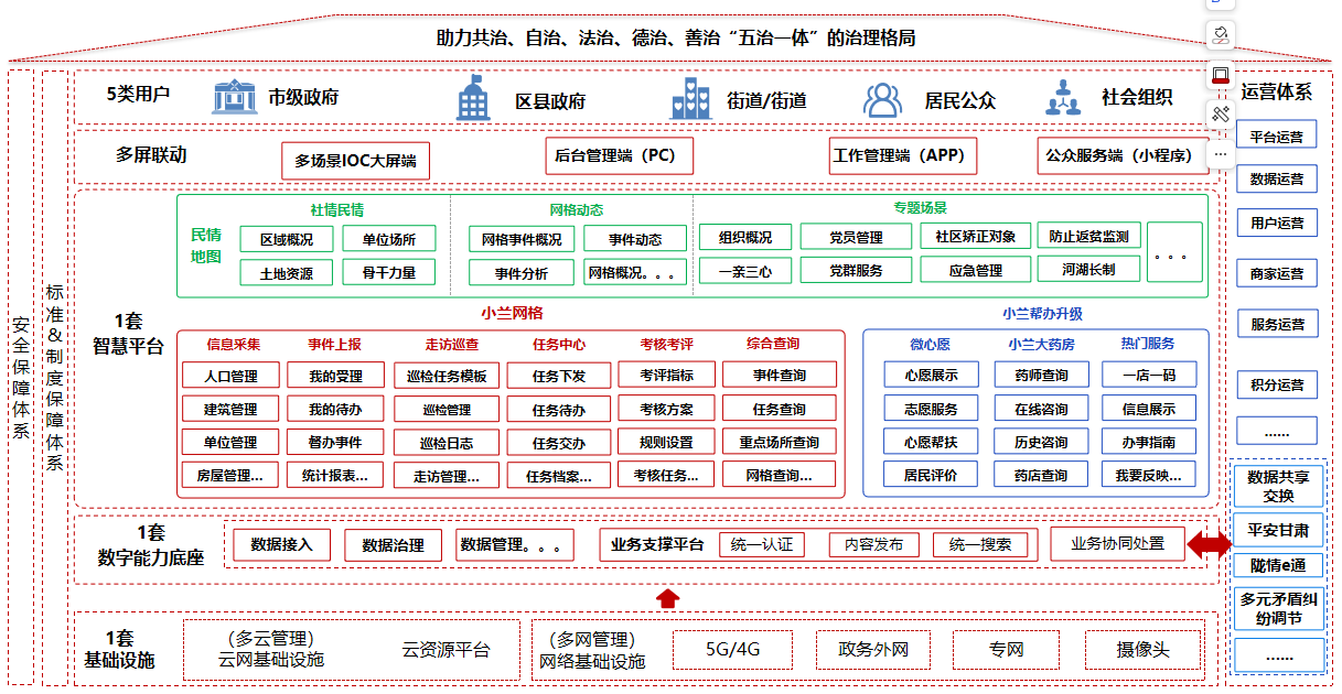 平台按照“做实四项数据底座、搭建三大应用板块、建强指挥运行体系”的总体规划,旨在发挥大数据、云计算、人工智能等新兴技术优势,横向服务于“镇(街)、村(社)、组(小区)”三级党的领导和党的建设,纵向服务于“大数据+网格化+群众路线”协同治理机制,为构建全新的“田字型”基层治理体系,在更高水平实现全市基层治理“数据整合共享、业务闭环协同”提供数字力量,努力打造“共治、自治、法治、德治、善治“五治一体”兰州市基层治理新格局。平台整合各类资源,协同条块力量,“以人为本、以数为基、以技为用”,打通“治理壁垒”,实现全市基层治理的智能化、专业化、社会化和规范化,达到“底数清、情况明、管得住、自治好、服务优”的基层治理总体发展目标。