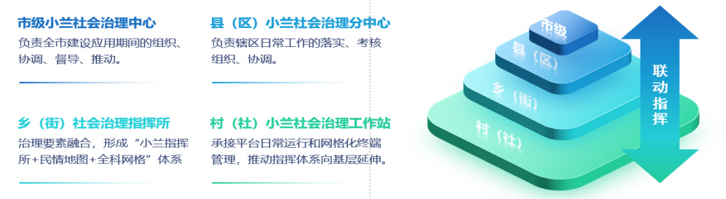3.建强指挥中枢。在市县两级层面,打造实体化运行的小兰社会治理中心(县区为分中心),利用平台统筹,负责支撑日常工作和建设应用期间的组织、协调、督导、推动等任务。乡(街)级层面,利用平台管理,进一步增强小兰社会治理指挥所的整合力和统筹力,加快基层社会治理要素联动融合,推动形成“小兰指挥所+民情地图+全科网格”工作体系,努力打造集矛盾化解、研判预警、统筹协调、指挥调度等功能于一体的基层社会治理主阵地。村(社)级层面,以党群服务中心为依托,利用平台服务,推动小兰社会治理工作站建设,专门负责承接“民情地图·小兰善治”平台日常运行和网格化终端的管理等工作,推动治理体系的“最后一纳米”尽可能的向基层延伸。