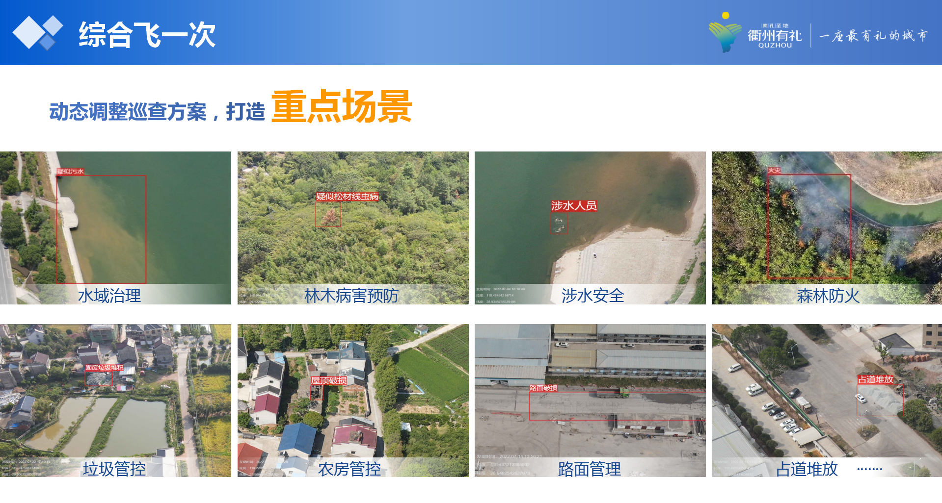 一是智能事件中枢综合集成破解数据壁垒难题。大脑事件中枢通过对接81类事件源归集508.31万事件数据,构建20余条事件分拨链路,实现了各系统多跨事件的统一分拨流转和全量智能调度,大大提升了基层治理的效能。二是智能服务破解模糊预警难题。通过设备的精准感知、模型的科学分析、智能模块的高效执行,推动治理业务从“模糊的前瞻性”进阶到“预测的确定性”,使辅助更智能。以“综合飞一次”为例,通过大量视频、图像感知等46种算法要素,对无人机回传的地面信息进行综合分析,自动识别地面异常问题,并将产生的感知预警数据自动转换为预警事件推送至基层智治综合应用后续处置。三是事件自动预警破解风险反应缓慢难题。事件上报到基层智治综合应用之后,通过智能事件中枢智能分析,自动预警潜在风险事件,快速通知县级社会治理中心工作人员,通过发起掌上指挥模块组织周边职能部门、网格员等力量,快速将整个事件闭环处置。