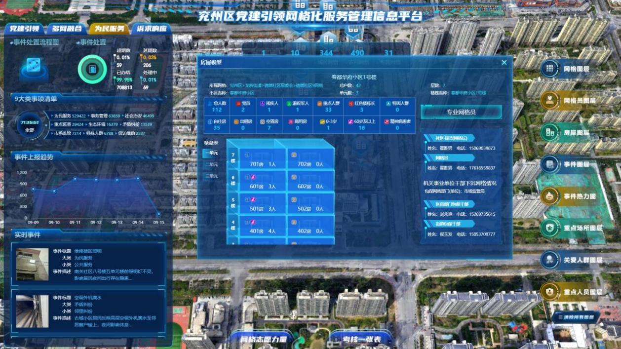建立“重点人员、治安环境、民生诉求、环境保护、河道水务”大数据五大分析场景,通过二维标识、三维定位、视频监控,实现对人地事物情组织等要素的精准掌控。平台重点标注高龄老人、残疾人、低保户、信访人员等各类特殊人群,细化“民情地图”,方便网格员重点巡查走访、精细服务。建立全区易涝点位标识三维地图,对比雪亮工程实时监控,建立应急预案,雨季高发时段加大线上巡查力度,实时监控预警。