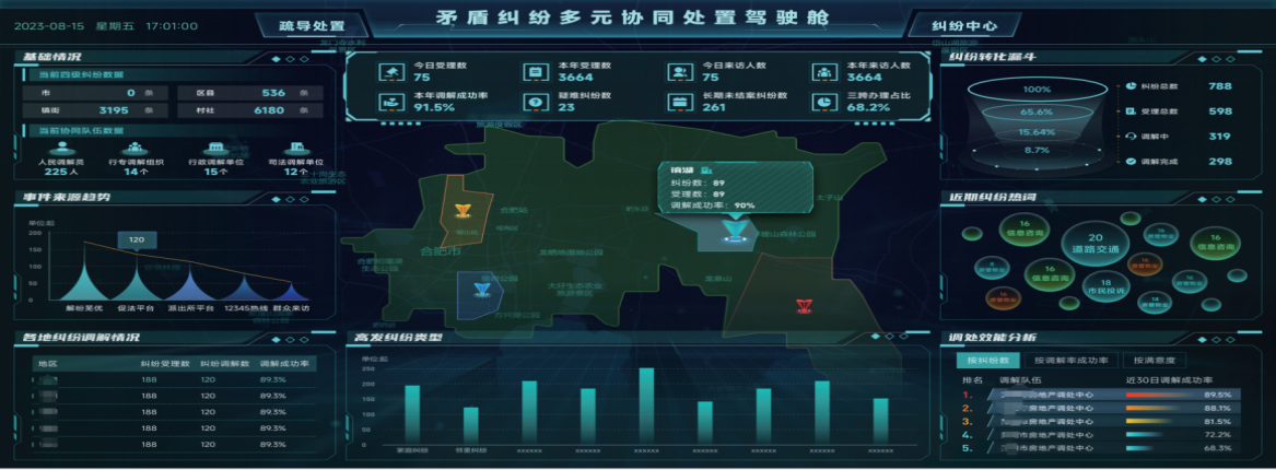 为坚持和发展新时代“枫桥经验”,落实好预防在前、调解优先、运用法治、就地解决,满足“矛盾成因溯源、数据深度研判、疏导智能处置、心理风险干预”矛盾纠纷化解实战化需求,合肥市委政法委牵头,利用大数据优势,整合各部门、各层级、各类型调解力量,建设合肥市多元矛盾纠纷管控与化解效果评估平台。平台具备多元社会矛盾图谱查询、信息采集、综合分析、预测预警、心理干预建议、化解处置、指挥管控、一体化协同等功能,实现人民群众诉求“一站式受理、一揽子调处、全链条解决”。