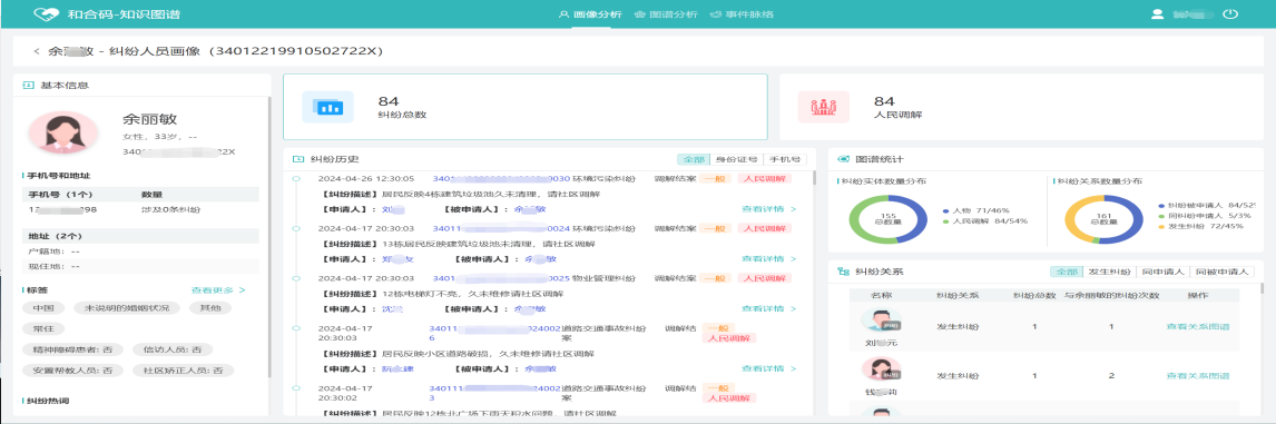 5.矛盾纠纷知识图谱。支持对干系人信息、关联人信息的查询以及时序关联案件的检索,便于及时研判分析,发现、预警重大矛盾纠纷隐患。