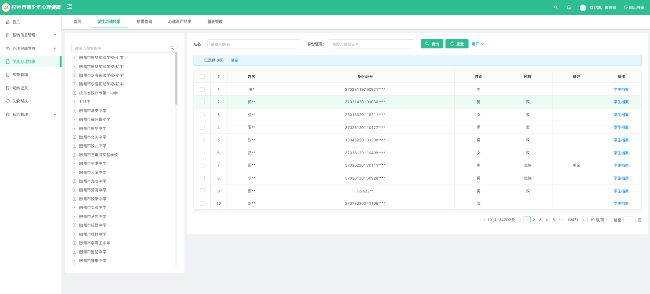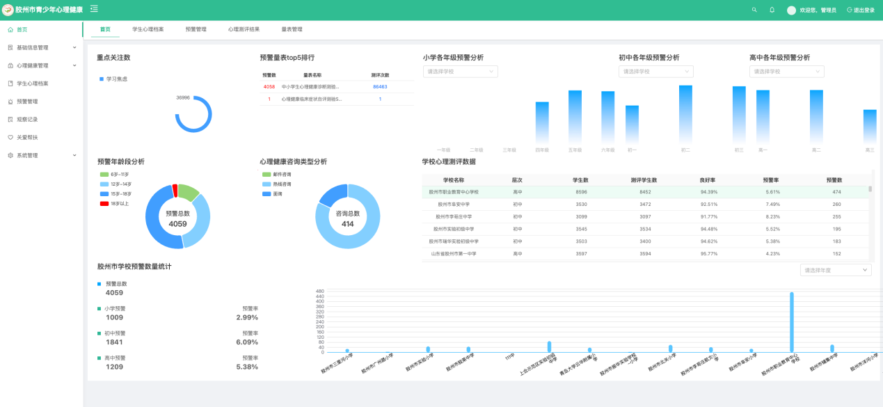 平台上线运行以来,已经覆盖了胶州市各个中小学校,对全市12万中小学生进行了心理测评,实现全市所有中小学心理健康评测工作排行,并通过平台测评出疑似存在心理问题的学生,结合心理老师、班主任日常观察,分析每个年级学生心理健康的整体态势,提醒重点关注哪些心理问题,联合教体局、卫健局等多部门对青少年心理健康进行共同关注与干预,形成对全市青少年心理健康情况的整体把控。