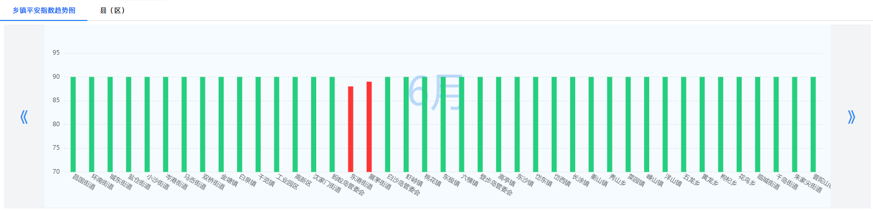 4.平安态势场景。实现对各县区平安指数、各乡镇街道风险管控力指数的排名以及五色图展示。同时,根据业务系统数据分析,可生成并导出平安态势分析报告。