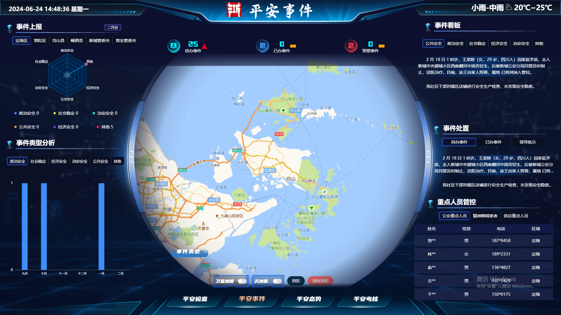 2.平安事件场景。采集录入“除险保安每日要情”相关案事件信息,通过智能算法进行动态分析并生成除险保安五色图,晾晒展示事件类型、事件高发区域等相关统计指标。另外,建立重点人员动态库并进行统一管理,为人员动态分析、行为轨迹分析等提供支持。