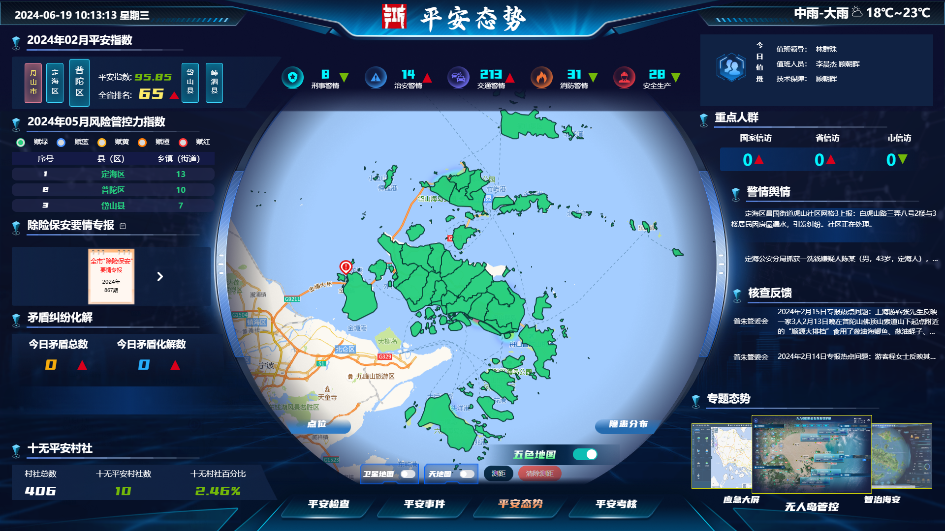 2023年以来,舟山市委政法委深入贯彻《浙江省平安建设条例》,坚持以高水平安全保障高质量发展,健全完善社会风险闭环管控大平安机制,加强常态化除险保安,着力打造平安风险智控平台应用,构建“一码(平安体检码)、一图(除险保安五色图)、一指数(风险管控力指数)”,推动实现社会风险常态排查、平安建设常态评价、除险保安常态晾晒,并在杭州亚运维稳安保、安全生产大排查大整治等重大活动中得到实战检验,进一步提高了平安风险源头发现、动态预警、流转处置、评价反馈的能力水平。截止2024年6月底,各地各有关部门依托平安风险智控平台,累计开展平安、应急、消防等检查67790人次,闭环整改较大以上问题隐患3203个,助力平安舟山建设精准高效。