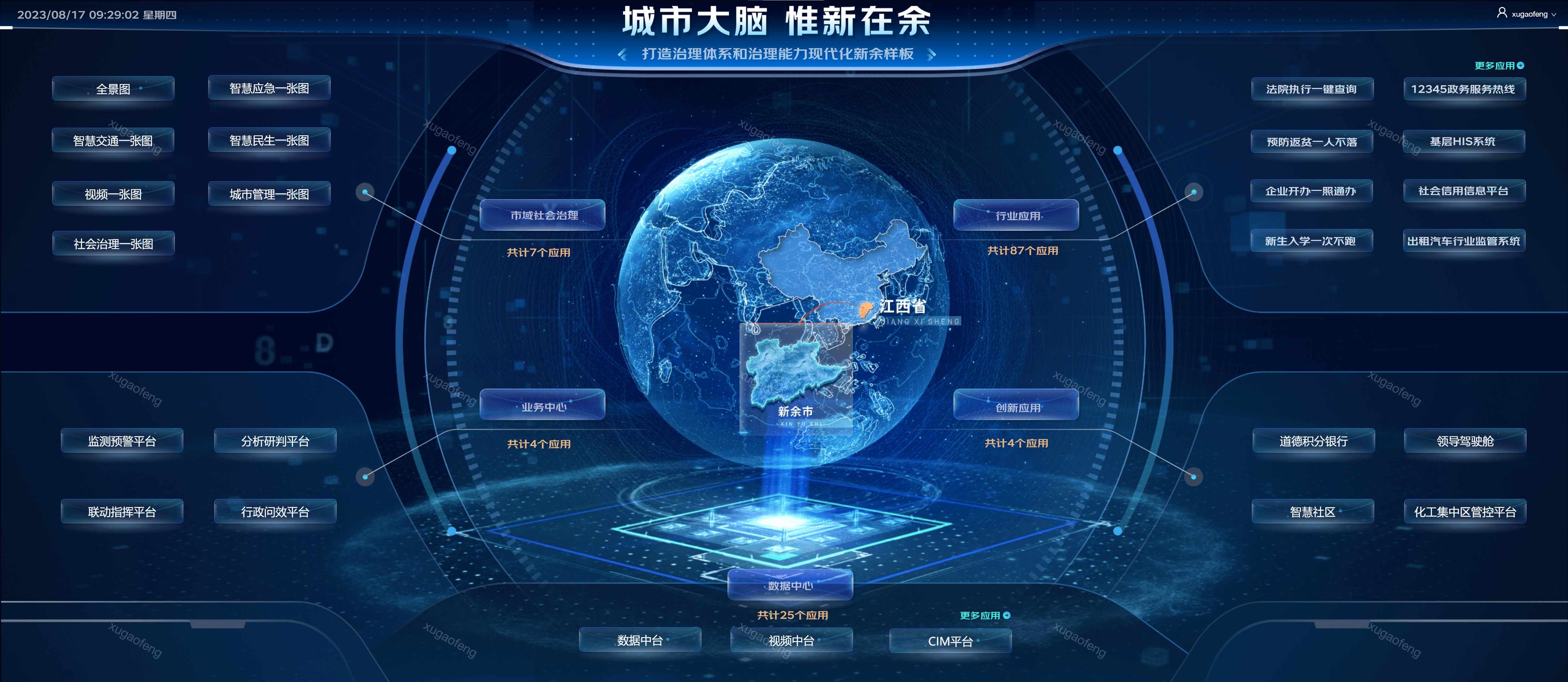 实现了多源多类数据资源汇聚共享,全域数据资源共享水平全国前列,全省领先。一是政务数据“能归尽归”,推动全市公共数据的集中管理和高度共享,汇聚全市64个部门、6415个数据目录、10亿条基础数据资源,发布服务接口超过4万个,共享交换6000多万次。二是视频资源“应融尽融”,视频数据共享对接单位12家,公安、安防小区、矿山等部门等2.2万路视频资源已全面接入,正在接入出租、渣土车、网约车等移动视频约400多路,拓展了视频资源类型,部署视频算法49种。三是时空数据“应上尽上”。基于已建成的CIM平台,形成了新余市城市“底板”数据,完成空间数据对接单位8家,对接专题数据6大类,接入图层数 183个、图斑数1056万个,发布地图服务113个。四是信息系统“应接尽接”。实现应用系统应接尽接,到目前为止累计接入全市业务系统近90个,覆盖30个单位,为全市跨部门联动、跨业务联通提供系统支撑。