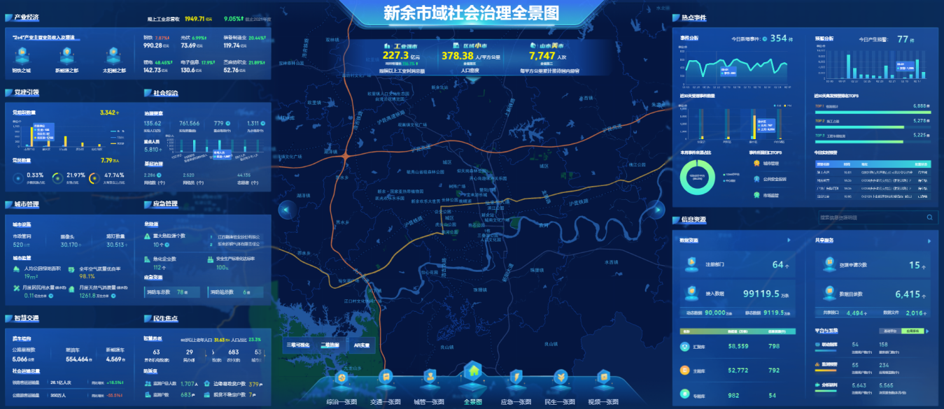 一是城市状态一网感知。治理是手段,防范才是根本。通过部署5大类、49个算法,基于“分析-预警-发布”流程,构建全景、跨部门、实时的监测预警风险防范体系,实现从事后的“堵漏洞”向事前的“防风险”转变。二是城市数据一网共享。全面汇聚的全市64个部门、6415个数据目录、10亿条基础数据资源,以及公安、安防小区、矿山、出租车、渣土车、网约车等移动视频等2.2万路视频资源,夯实了数据底座,同时基于已建成的CIM平台,形成了新余市城市“底板”数据,对接专题数据6大类,接入图层数 183个、图斑数1056万个,发布地图服务113个。各部门依托数据底座,实时进行共享交换,为全市跨部门联动、跨业务联通提供系统支撑。三是城市事件一网调度。建设“图上”指挥调度系统,实现“一个底座汇数据、一张全图调全余”。在小屏端支持多网协同,为领导提供最新的信息和关键指标,实现决策信息“一端统览”;在中屏端实现事件管理“一网通转”,支持全域事件跨层级、跨部门高效流转;在大屏端实现数据、视频、地图、3D模型融合应用,支持城市风险及时告警、事件协同处置,实现“一图调度”。打造横向到边、纵向到底的事件流转体系,横向实现跨委办局的全面协同,纵向实现市、区县、乡镇/街道、网格四级流转。四是决策信息一屏统观。开发领导驾驶舱,将大小市情、分析研判报告和400余项关键数据指标推送至领导手机,辅助领导决策。大小市情包括提请领导关注事件和高频事件,数据指标覆盖经济、综治、民生、交通、城管、应急等6类主题,实现新余市情日日达、分析研判专题报,做到上报信息有速度、指标分析有广度、专题研判有深度、事项督办有力度,领导驾驶舱与指挥中心联动,支持应急处突等指挥调度。