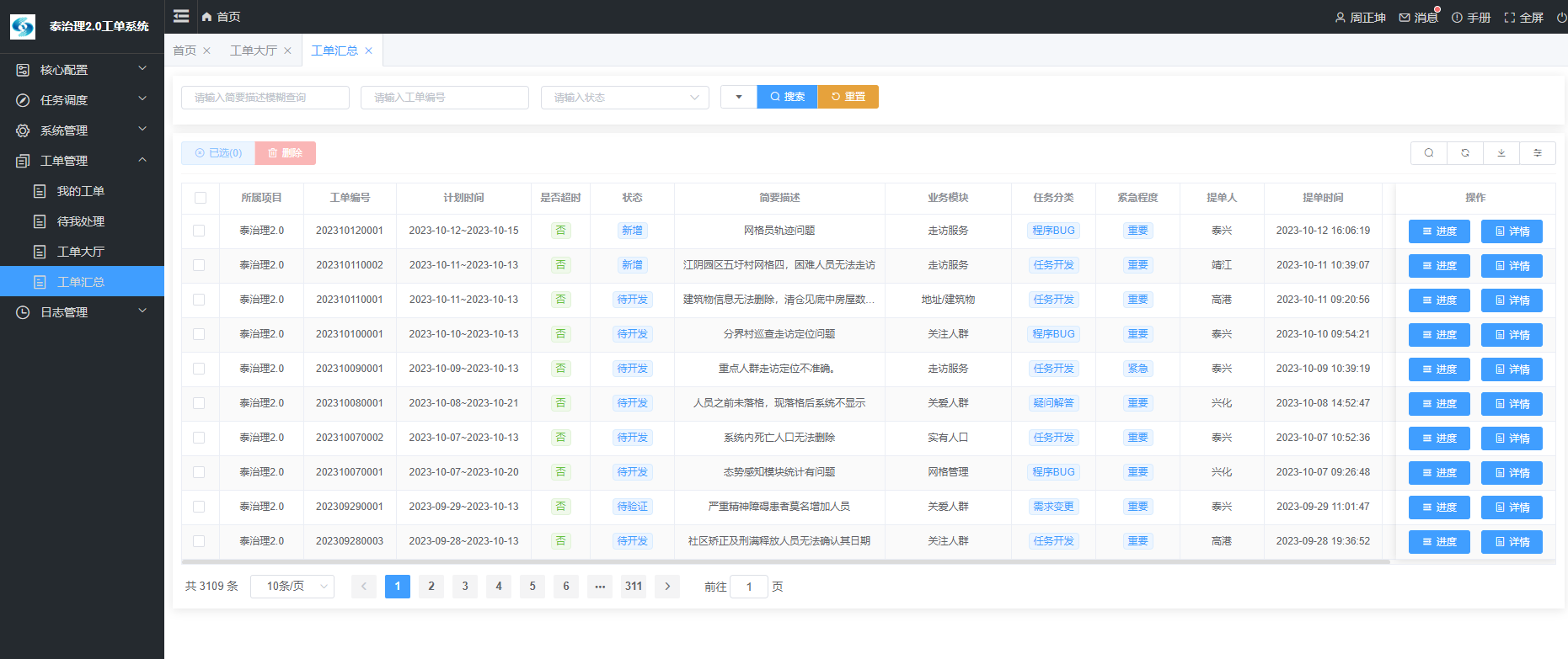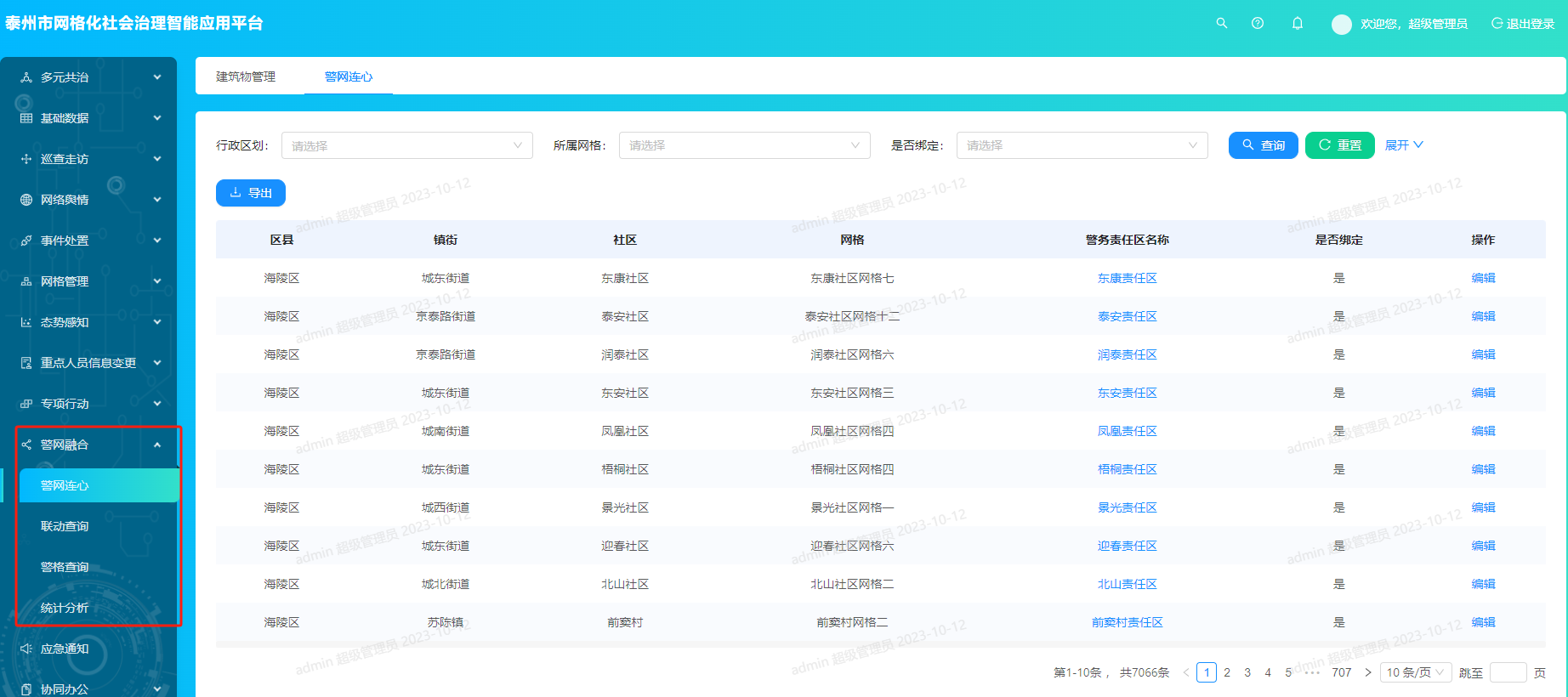 1.事件工单“一网处置”。强化部门联勤联动和平台互联互通,以打通“泰治理”与12345平台、开通镇街部门账号等方式,实现三级以上网格复杂事件有序流转、快速处置;开发“警网融合”功能模块,开通基层民辅警账号,实现网格警格一一绑定、双向派单、联动联处。