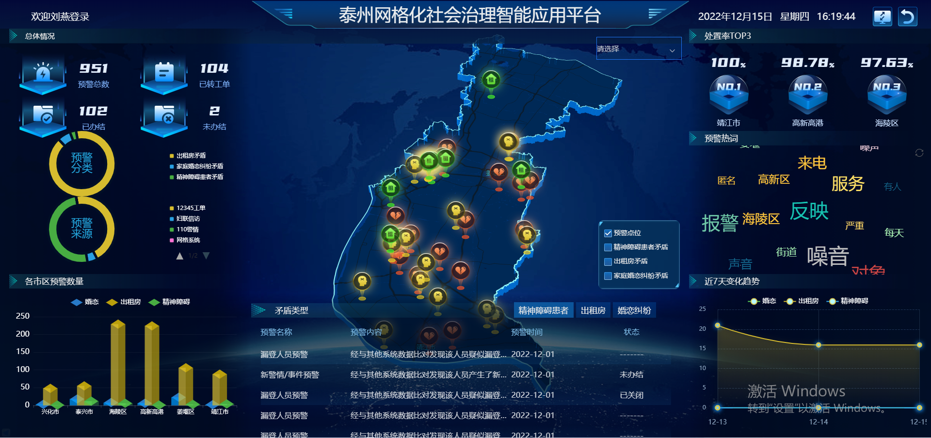 围绕严重精神障碍患者、“一老一小”等重点关注人群,出租房、群租房等重点场所以及网络舆情、燃气安全、电动车安全、电信诈骗等重点领域的管理服务,积极发挥“网格+”治理优势,深入推进多网融合治理模式,在“泰治理”开发相应功能模块,通过强化信息更新维护、常态化巡查走访、异常动态监测处置等措施,进一步凸显网格在维护平安稳定的前沿作用和兜底功能。2023年处置各类事件(矛盾)104万条,日均3500余条,各类特殊人员、关注对象以及重点场所巡查走访率100%且有迹可循,未发生“民转刑”命案、因四类重点人群漏管失控造成重大社会影响的案(事)件,有效维护了全市平安稳定大局,2023年泰州市获评“全国市域社会治理现代化试点合格城市”。