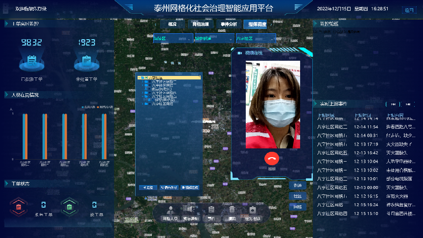 4.指挥调度“一键可达”。依托“三级指挥、四级联动、五级协同”的指挥体系,各级指挥中心可通过平台视频点调、语音外呼、视频会议等功能,对下级指挥中心及网格长、网格员“一键调度”“实时指挥”。