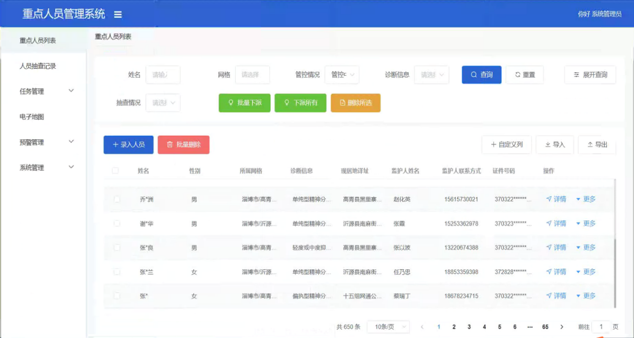 完善精神障碍人员的亲友家属、活动情况、稳控记录、走访记录、抽查记录等信息,落实服务管理和风险管控责任措施。截至目前,全市精神障碍人员共录入650人,纳入全科网格系统辅助走访人员649人,切实维护我市公共安全和社会稳定。