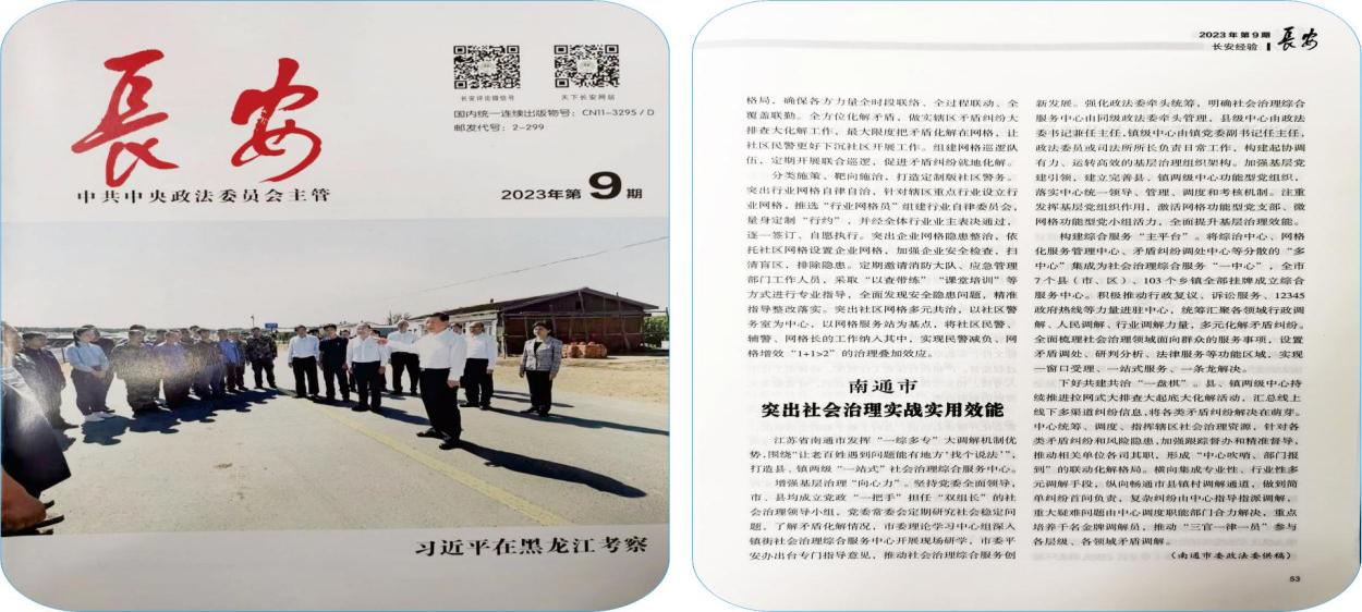 中央政法委《长安》杂志(2023年第9期)刊发江苏省南通市发挥“一综多专”大调解机制优势,打造县、镇两级“一站式”社会治理综合服务中心工作经验。