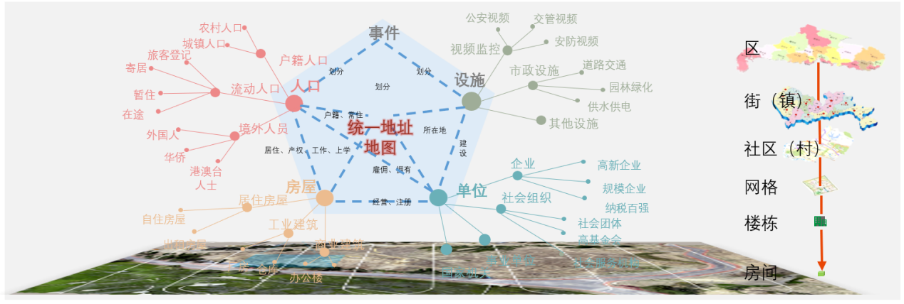 将分散在各部门的人口、房屋、组织、事件、部件等治理要素,按照管理层级封装到区、街道、社区、网格、建筑物、房屋等治理单元,构建要索关联关系,将分散的、重复的、难于访问的各部门数据整理融合成集中统一的、有价值的社会治理全量数据,织成了一张动态、多样、鲜活、立体的数据融合关联网。