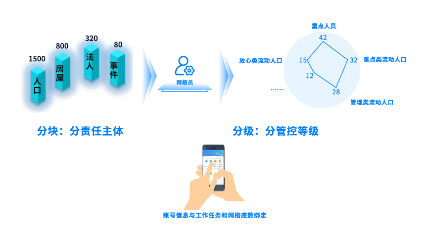建立管理对象的关联关系,对数据“分类(类型)、分级(级别)、分块(责任)”,将数据资源按照管理责任精准下沉至基层,实现数据精准“进格”、任务秒派到人、责任落实到人。工作人员“按单作业”,工作方式“变采为核”,提升工作效率、减轻工作压力。
