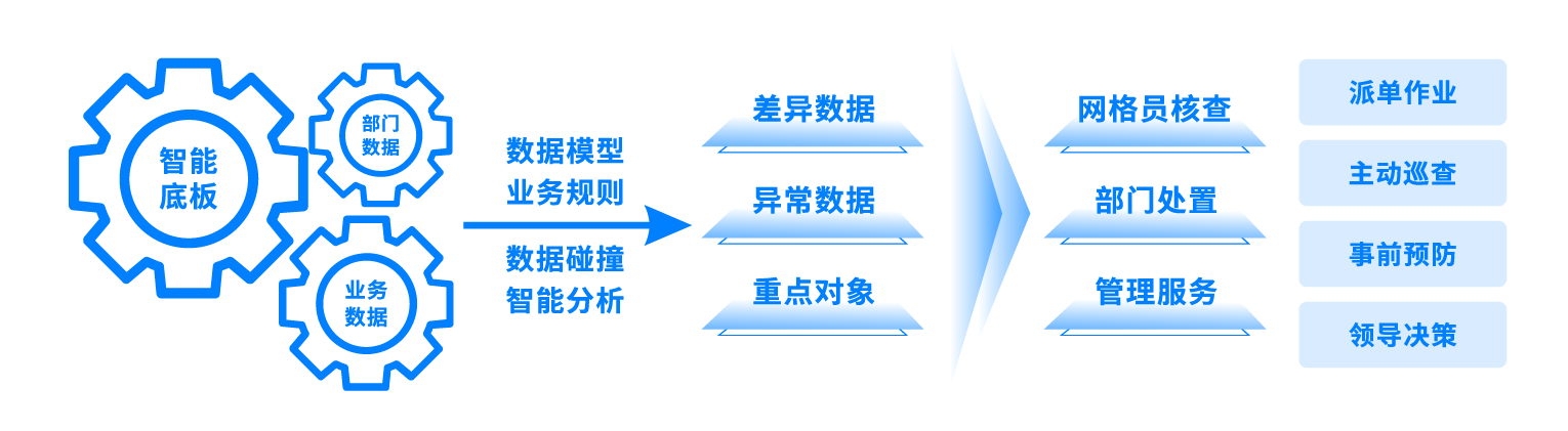 构建全量数据数据模型,通过设定业务规则、碰撞数据差异等方式产生任务,推动治理理念转变,从“事件驱动、事后处置”变为“数据驱动、事前预防”,打造“数据-业务”双轮驱动的社会治理新范式。