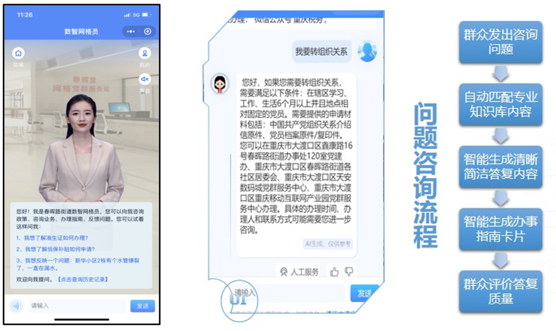 践行人民城市理念,探索超大城市现代化治理的新路子。重庆市委提出,要持续拓展基层智治体系实战效果,把基层更多时间和精力用在服务群众、服务解决矛盾纠纷夯实平安基础上。深入贯彻落实好党中央、市委要求,重庆市大渡口区春晖路街道聚焦超大城市中心城区镇街定位,基于“141”基层智治体系架构,紧密围绕老旧小区多、人员构成复杂、服务管理难等辖区实情,试点开发基层智治平台“AI数智网格员”应用,构建政务领域政策文件、办事指南、高频事项等知识库,经过专业训练后形成较为强大的智能支撑能力,为具体网格工作提供人工智能支持,靶向破解网格员任务多负担重、服务管理触角延伸不够、网格治理不精准等难题,实现网格员负担大幅下降和基层治理效能大幅提升的“一降一升”,更好推动解决联系服务群众“最后一米”问题。