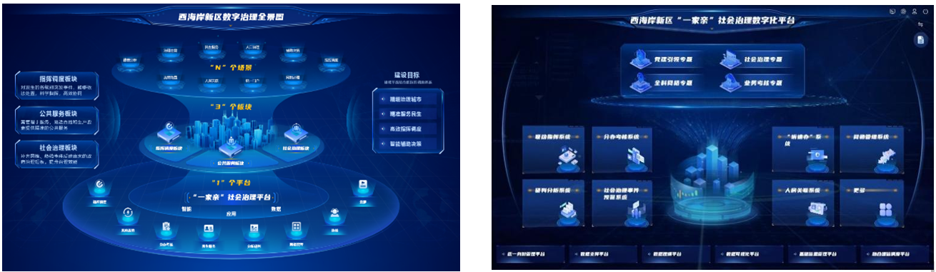 青岛西海岸新区“一家亲”社会治理数字化平台按照科学化、精细化、智能化和法治化要求,通过整合与社会治理相关的数据资源,深化拓展社会治理功能,充分发挥“网格化+数字化+智能化”建设职能优势,确定了“1+3+N”数字治理整体建设架构。“1”即1个西海岸“一家亲”社会治理平台,包括联动指挥、分办考核、研判分析、社会治理事件预警四大系统,同时接入了“诉速办”、智慧党建等平台,整合形成了一个社会治理应用门户;“3”即“公共服务、社会治理、指挥调度”3大业务板块;“N”即围绕新区特色打造的多个数智治理应用场景。