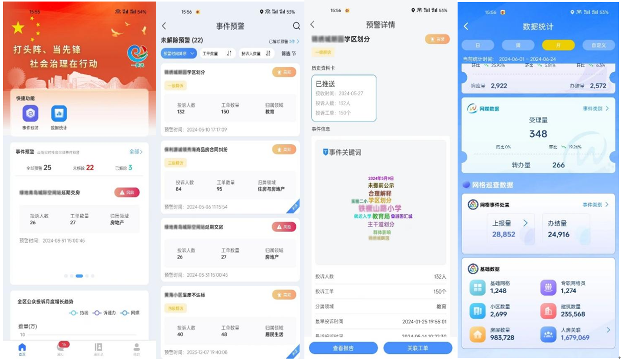 为各级领导掌握社会治理情况、研判形势、科学决策提供参考,实现“领导在哪里,决策就在哪里”的目标,推动事件快速处置,开发了“一家亲”社会治理APP。APP可实时同步分析各类社会治理数据,通过图表、报表等形式,实时展示关键指标的变化趋势,统观网格、热线、“诉速办”、网媒等工作的办理情况,为领导提供即时、准确的数据支持,并实现一站式信息查询;APP创建了事件预警功能,可实现平台端与移动端的高效联动,为各级领导开展预警事件的深入探查、了解区内热点风险变化趋势提供了灵活易用的便捷工具;APP全面整合各个部门和岗位的联系人信息并根据部门、职务、岗位等条件对联系人进行智能分组,确保各级领导能够方便地查找和联系相关人,从而高效开展研商调度工作,促进不同部门间的信息共享与协作,打破信息孤岛,提升整体工作效率。