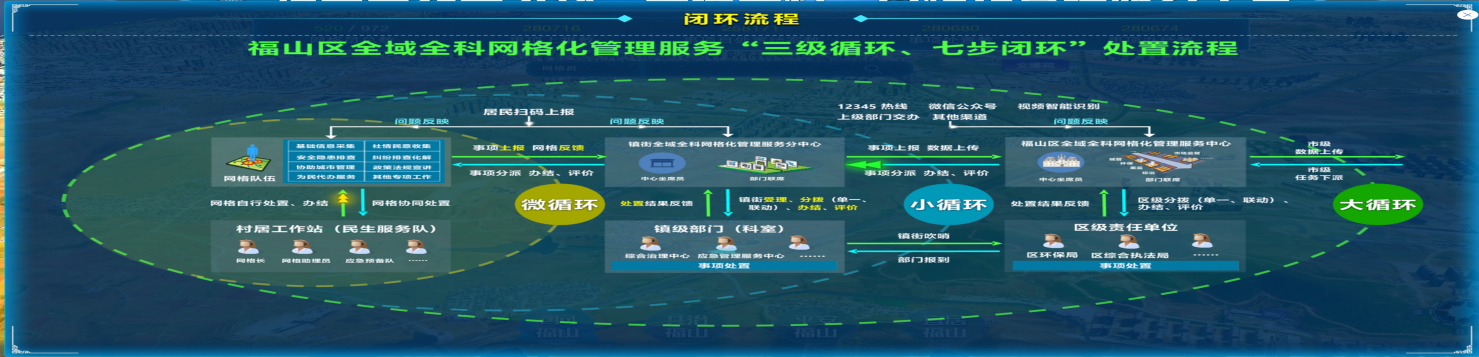 (六)制定一套工作流程——“三级循环、七步闭环”的处置流程,以事要解决为目标,构建起“网格微循环、镇街小循环、区级大循环”的“事要解决”三级循环,以及“上报、受理、分拨、处置、反馈、办结、评价”七步闭环的处置流程,用来汇聚和解决民生诉求。