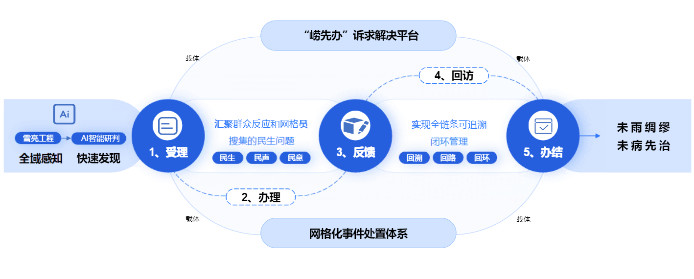 以“崂先办”诉求解决平台和网格化事件处置体系为载体,对群众反映和网格员搜集的民生问题,从受理、办理、反馈、回访、办结到满意度测评,实现全链条可追溯闭环管理。同步利用全域感知网调取“雪亮工程”摄像头进行分析研判,运用AI算法智能感知快速发现问题,实现社会治理的“未雨绸缪”和“未病先治”。