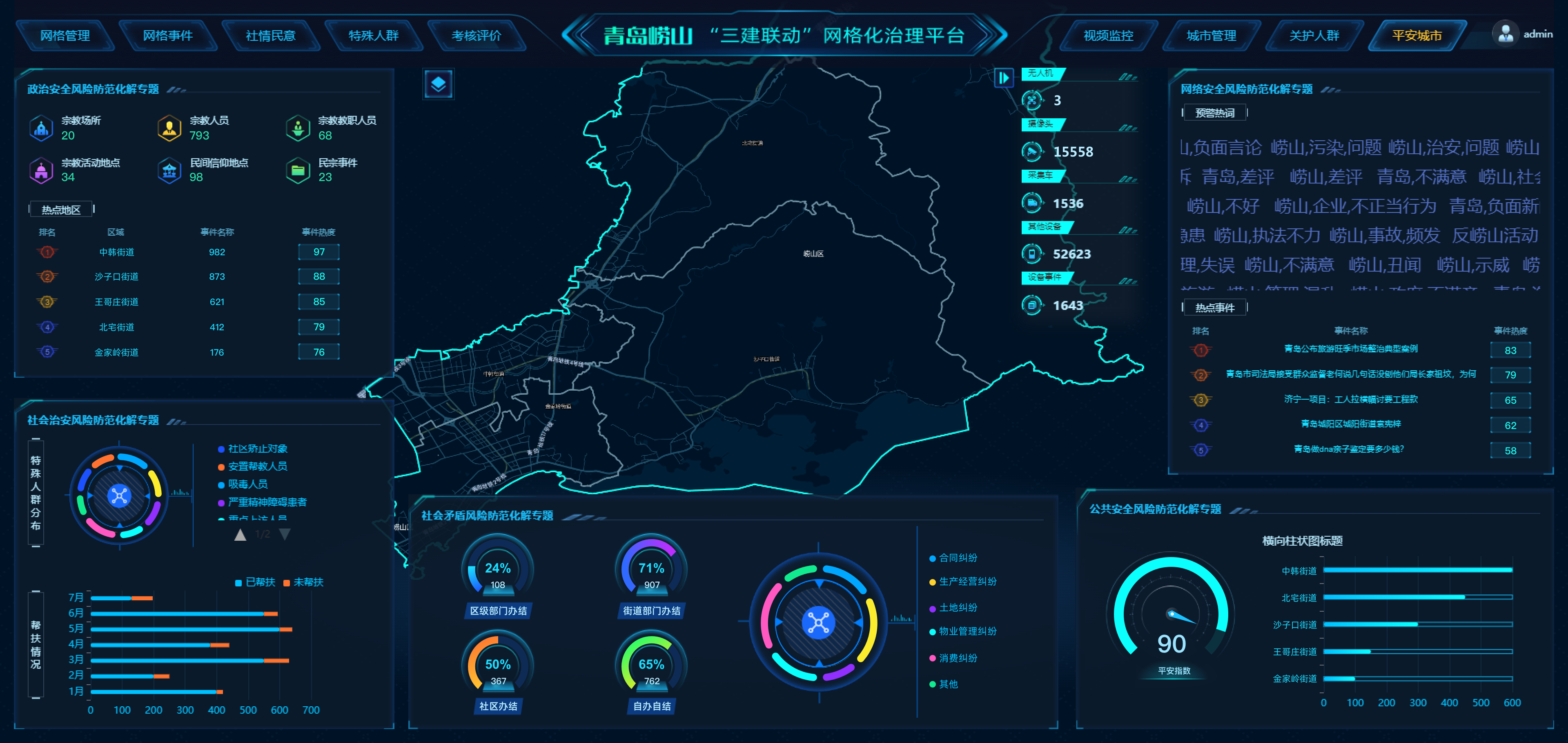 在现有数据互联互通基础上,积极探索云脑原生云数据库应用,深入挖掘云脑全量基础库数据价值,整合分析12345热线、“崂先办”平台、数字城管、互联网舆情等事件数据,寻找潜在规律、提前预判风险、优化力量配置,为网格化管理提供精准人物和事件画像,提升辅助决策能力。