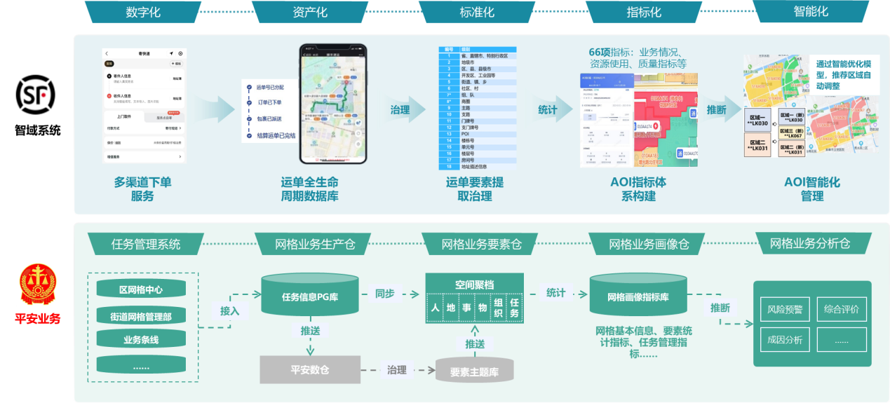 丰图智域系统旨在为顺丰提供基于位置的运单数字化管理服务,建立了一套完善的融合千亿级语义地址信息、业务区域深度信息、网格负荷信息、任务规划信息、资源调度信息的时空数据基底,为快递物流从客户下单、智能调度、中转分拣、时效运输、安全管理、末端派送、经营管理、市场决策的全闭环过程提供有效支撑。该服务能力与平安建设中的“数智网格化+”的工作统筹、人员入格、任务执行、考核督办、管理优化的全过程具有高度相似性,具备借鉴作用。