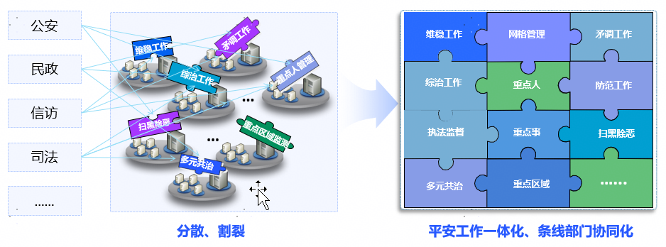 从业务工作来看,一方面,平安政法所涉及到的业务中,过去的经验、案例、台账等无法直接转化为知识,甚至难以查询,普遍存在系统之间互不相通、业务割裂的现象,工作缺乏完整的体系,无法对过程进行监督跟进,亟需一个能够统筹条块的综合平台来抓总、督办。另一方面,各业务工作的开展缺乏指导手册式的规范、标准、流程、要求等约束,主要依托执行人的主观理解、经验、责任心等,易导致同样的业务工作在不同单位的工作要求、执行方式存在一定差异。