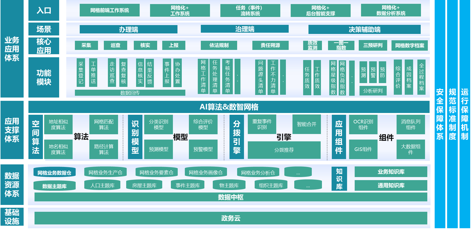通过平台提供的数据、工具等基础支撑服务,开展平安应用系统建设,包括网格前端工作系统、网格化+工作系统、任务事件流转系统、网格化+后台智能支撑、网格化+数据分析系统等板块,依托办理、治理、决策辅助三个入口场景完成网格核心业务应用的建设。