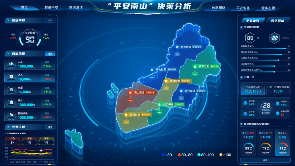 整合平安条线数据,打造平安数据底板,推动平安成员单位跨部门协同,实现市、区、街道、社区、网格五级联动。