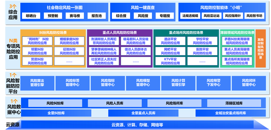 包括宏观社会稳定风险一张图、风险一键直查和风险防控智能体“小明”,以图、表、智能体3种形式提供社会风险防控的综合应用。社会稳定风险一张图,包括晾晒台、预警舱、赛马榜和报告池,实现各领域风险指标的晾晒、风险主体的预警、各地区风险排名的赛马、周期报告的生成调取。风险一键直查包括综合搜、风险搜和专题搜,提升风险信息获取效率。风险防控智能体“小明”包括法规透视镜、风险雷达站、风险指南针和风险智书坊,实现法律法规的智能咨询、风险态势的互动看数、风险处置的类案推荐以及风险分析报告的智能生成。