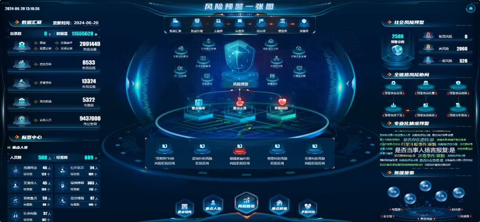 提供婚姻家庭纠纷风险防控等18个政法高频需求专项防控场景,并能基于社会风险智能防控平台能力,与客户共创N+本地特性风险及新型社会风险防控场景。