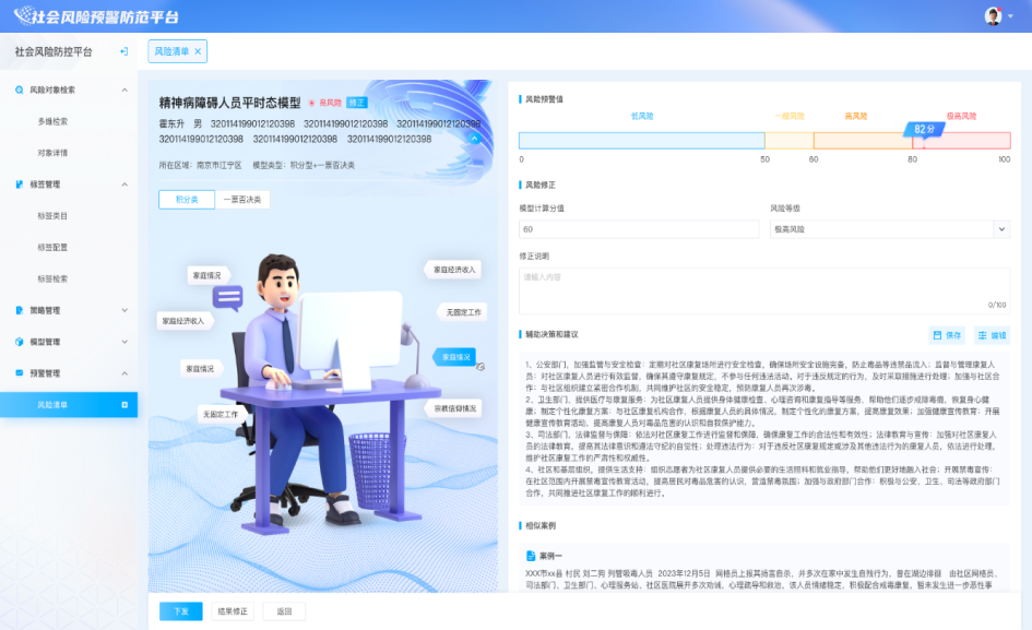 针对不同等级、不同类型的风险,平台会自动进行风险的透视及处置策略的推荐,辅助指导地方党委对辖区内的多作业部门进行风险管控工作部署,包括风险纠纷的包案化解、风险人员的管控帮扶、风险场所的专项整治、风险领域的两书一函等。确保各项风险得到及时有效的控制,避免小风险积聚酿成重大风险。