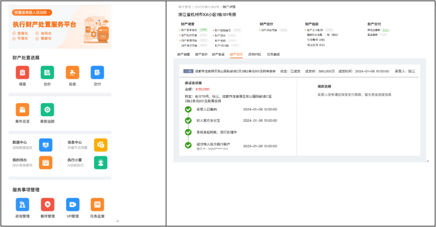 细化服务颗粒度,逐一明确25项服务标准,预约看样、电话咨询的等关键环节自动留痕、强制监管。关键节点短信推送执行法官,实时查看处置进度,加速资产处置效率。