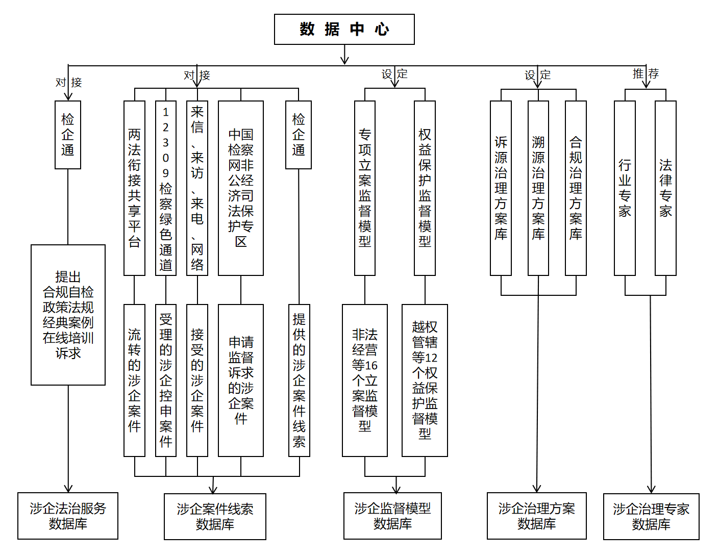 以高质量发挥检察护企职能为根本,建立一个拥有五大数据库的“检护企航”数智应用系统专用数据中心。一是通过部署“检企通”,方便企业提出合规自检、政策法规、经典案例、在线培训等法治服务诉求,建立涉企法治服务数据库;二是畅通大数据调用渠道,通过对接“两法衔接信息共享平台”直接接受流转的涉企案件,通过对接12309检察“绿色通道”直接受理涉企控告申诉案件,通过“来信、来访、来电、网络”直接接受涉企案件,通过对接中国检察网“非公经济司法保护专区”直接接受申请监督诉求的涉企案件,通过“检企通”直接接受报案、控告、举报提供的涉企案件线索,建立涉企案件线索数据库;三是通过研发挪用资金、强迫交易、非法经营等16个涉企专项立案监督模型,以及越权管辖、企业内部腐败、依法稳慎适用强制措施等12个涉企权益保护监督模型,建立涉企监督模型数据库;四是通过制定各类诉源治理方案、溯源治理方案和合规治理方案,建立涉企治理方案数据库;五是通过筛选行业专家、法律专家,建立涉企治理专家数据库。