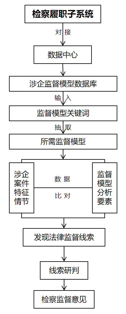 以高质量提升“监督质效”为目标,四大检察部门通过检察履职子系统登录数据中心涉企监督模型数据库,输入监督模型关键词,提取所需监督模型,将涉企案件特征情节输入后,自动与监督模型分析要素进行数据比对,从而发现法律监督线索,最后,依据线索研判结果提出检察监督意见。