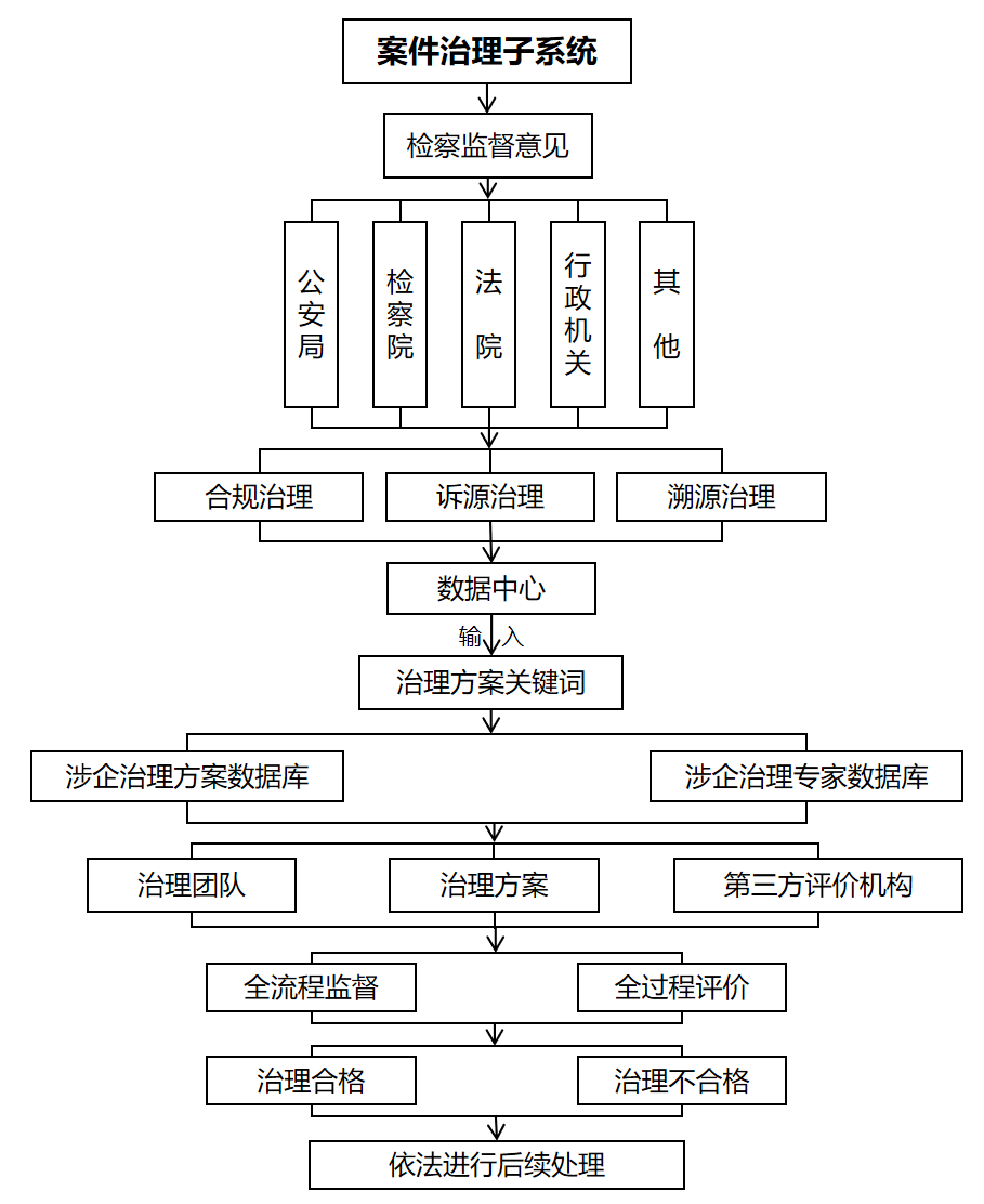 以高质量保障企业权益为核心,四大检察部门联合公安局、法院、行政执法机关和其他组织等,开展合规治理、诉源治理、溯源治理,做好涉案企业“后半篇文章”。通过案件治理子系统登录数据中心涉企治理方案数据库和涉企治理专家数据库,根据检察监督意见,输入治理方案关键词,获取所需的治理团队、治理方案和第三方评价机构。治理工作开展后,检察机关实施全流程监督,第三方评价机构实施全过程评价,本系统全轨迹留痕。对治理合格企业可依法免除或减轻刑事处罚或行政处罚,对治理不合格企业应依法实施刑事处罚或行政处罚。