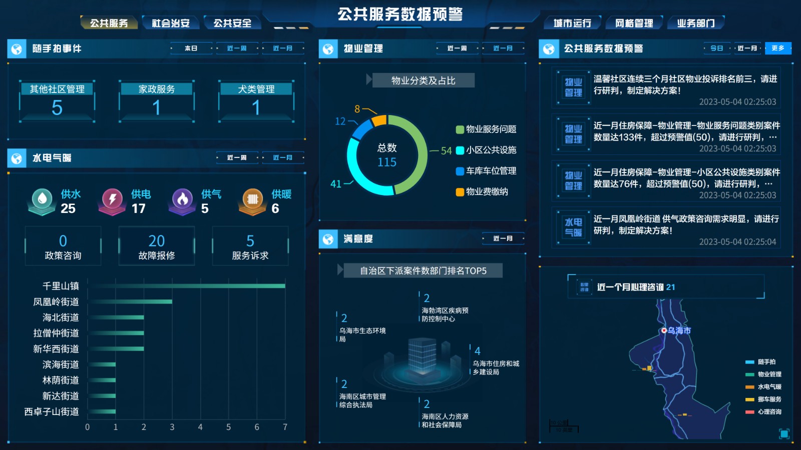 开发领导驾驶舱,将大小市情、分析研判报告和400余项关键数据指标推送至领导手机,辅助领导决策。建成多层级的市域社会治理现代化调度指挥中心,建立线上矛盾纠纷多元化解系统,覆盖市、县、乡、村、网格五级的矛盾纠纷事件、110非警务警情事件、“城市大脑”AI智能发现事件、12345热线事件、综治民生类事件、基层网格上报事件和群众“随手拍”事件,做到“看得见、管得了、叫得应、调得动”,形成“发现-分派-处置-问效”的业务闭环,实现大、中、小三屏联动和“平时处置调度、战时应急指挥”的目标。依托城市大脑这个数据底座,通过迭代开发,开发了道德积分、关爱老年人、法院执行、防返贫监测、创文创卫等一系列应用场景,极大提高社会治理水平。线上道德积分银行平台在中央政法委组织的第八次全国市域社会治理现代化会议上作典型经验介绍,并以专题片形式在第六次全国市域社会治理现代化试点创新研讨班上滚动播放。